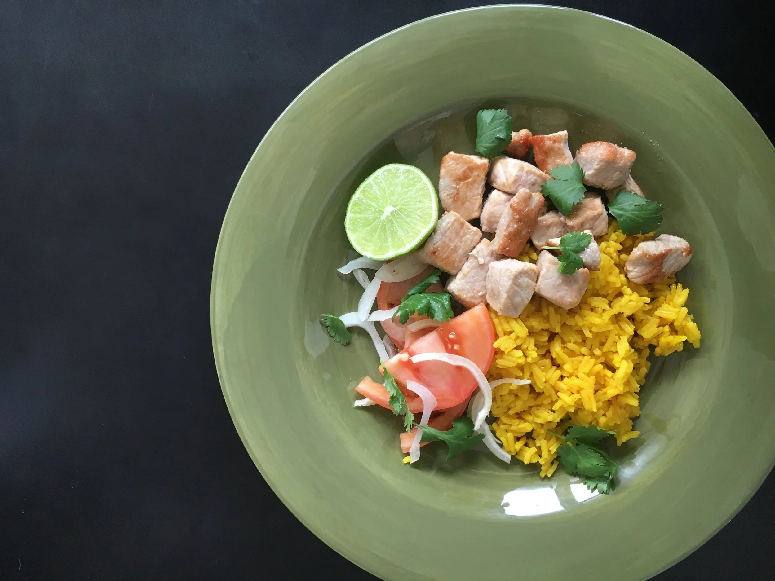 turmeric rice, tomato onion salad